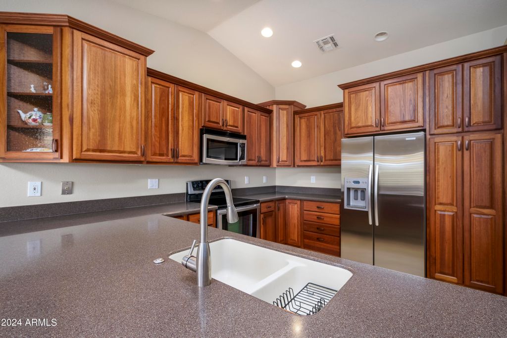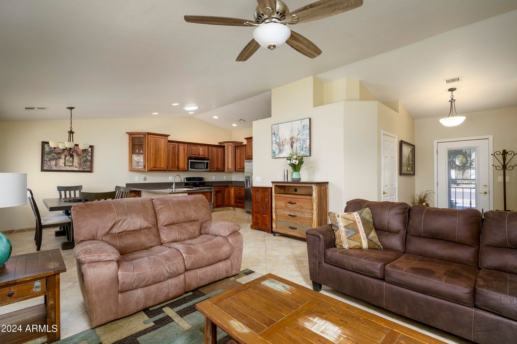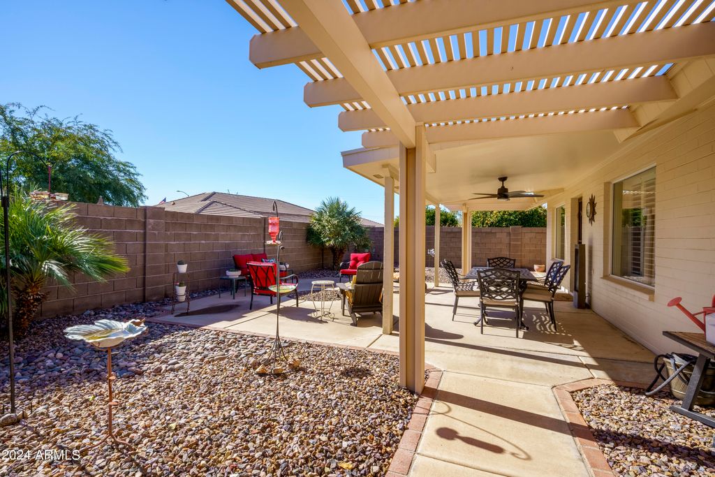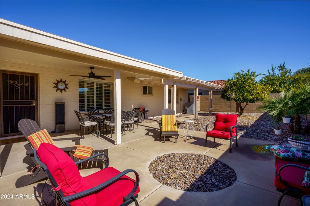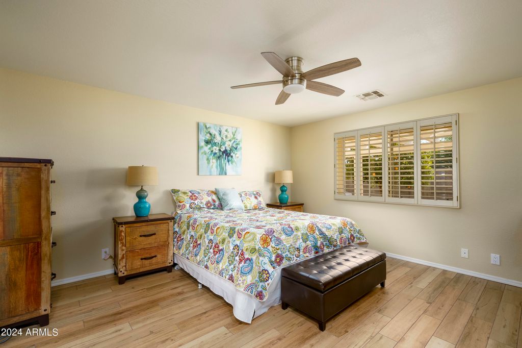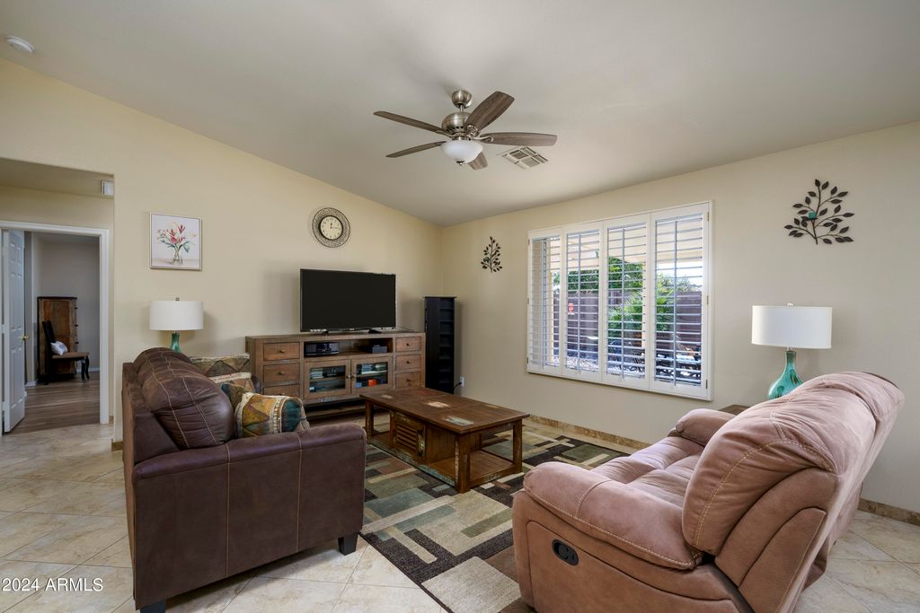 Right in the sweet spot, not to big, not to small! Almost 1,400 square feet, updated 2 bed, 2 bath, 2 car garage property in wonderful 55+ adult community of Sunland Springs Village. Spacious vaulted living room,beautiful tile flooring, plantation shutters across south facing back windows, updated fan/light fixtures, neutral palette throughout. Beautifully updated kitchen with staggered wood cabinets, crown moulding, stainless steel appliances, peninsula granite counter, pantry and recessed lighting, makes cooking a joy. Master bathroom has double sinks, 2 walk-in closets, updated tile relaxing shower. Relax in the late afternoon/early evening in the beautiful backyard, pergola-style covered patio, bbq area. New roof 2022, water heater 2024, A/C 2021....this home is waiting for you!