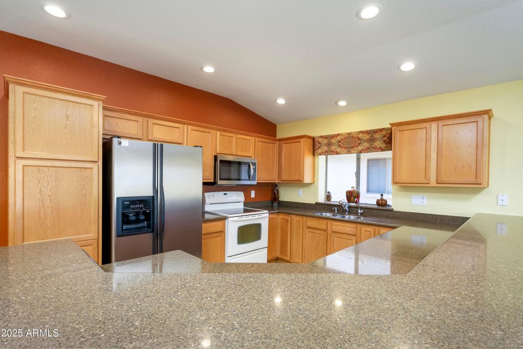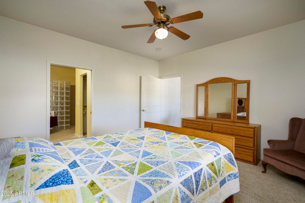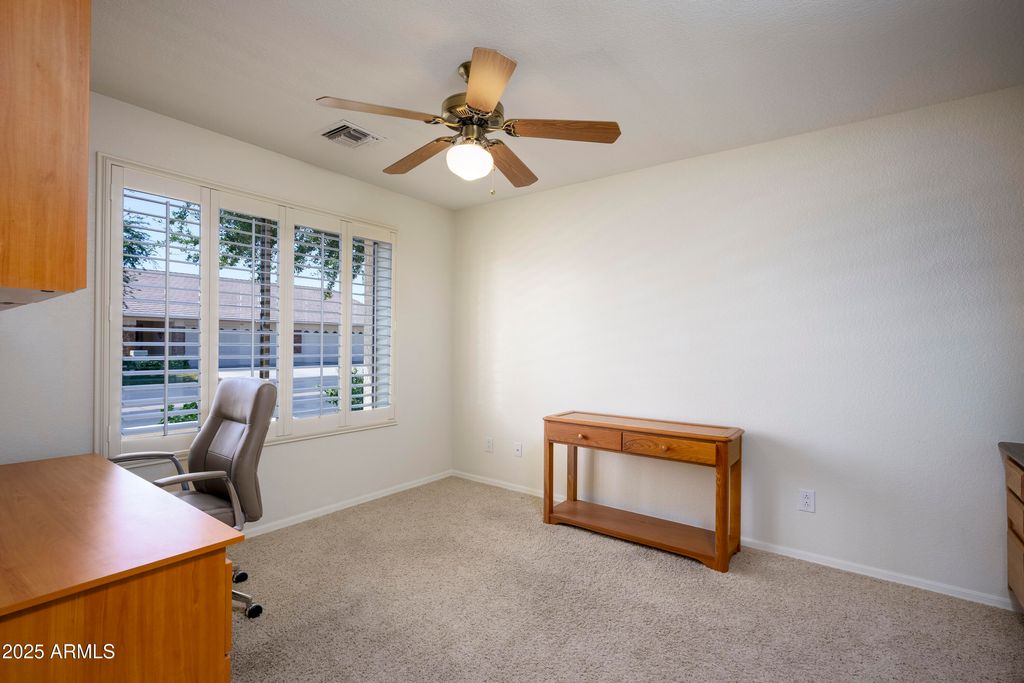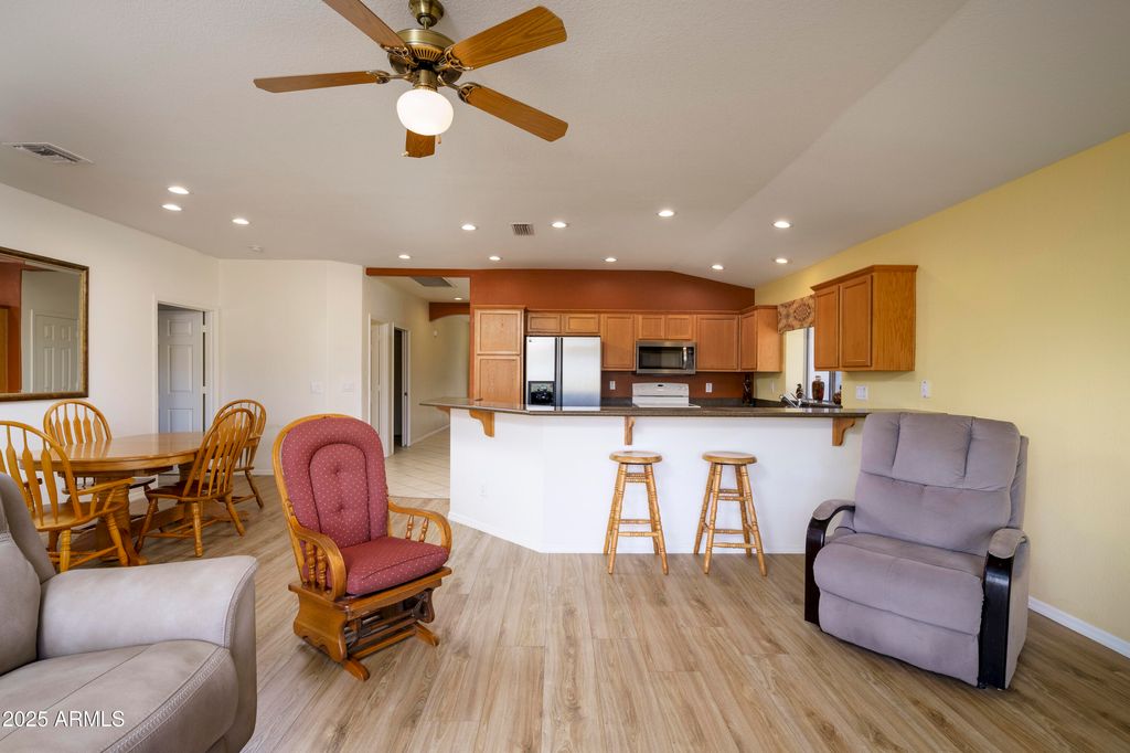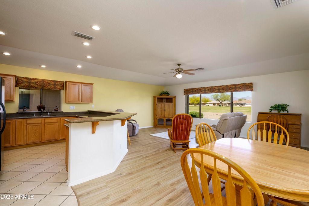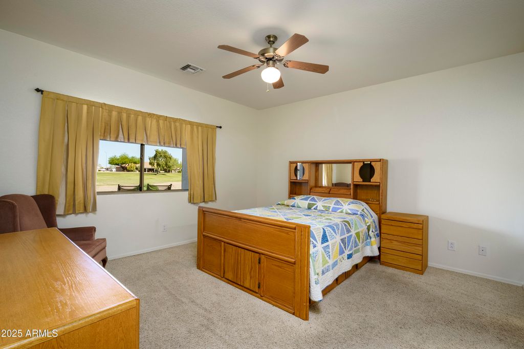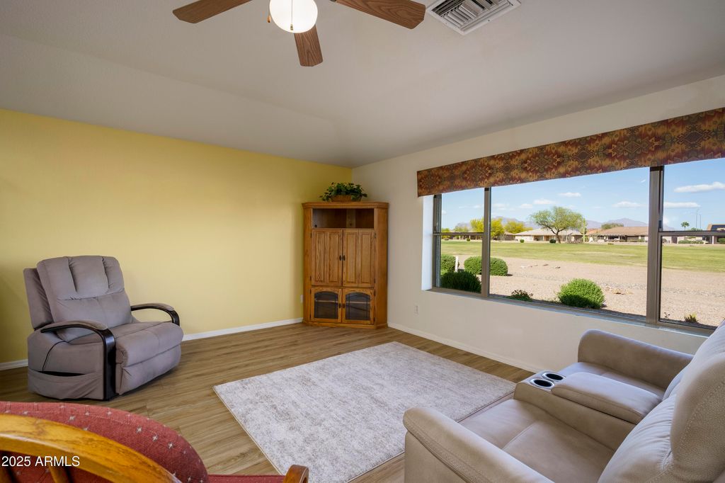 3 bed, 2 bath, 2 car garage golf course condo with east facing views of the Superstition Mountains. Spacious ''great room'' living and dining area, open kitchen, large windows allowing natural light. Upgraded kitchen counters, breakfast bar, all appliances offered with the property. Security roller shields on the large picture window and the patio. Guest bedroom near bathroom has pocket door creating ''en-suite'' guest bedroom. Front den/office/2nd guest bedroom, ceiling fan, plantation shutters. Master bathroom has double sinks, walk-in closet, glass block snail shower. Water softener in garage, built-in cabinets. Wonderful unit, active 55+ adult community with heated pools, tennis courts, pickle ball and much more....don't miss out!