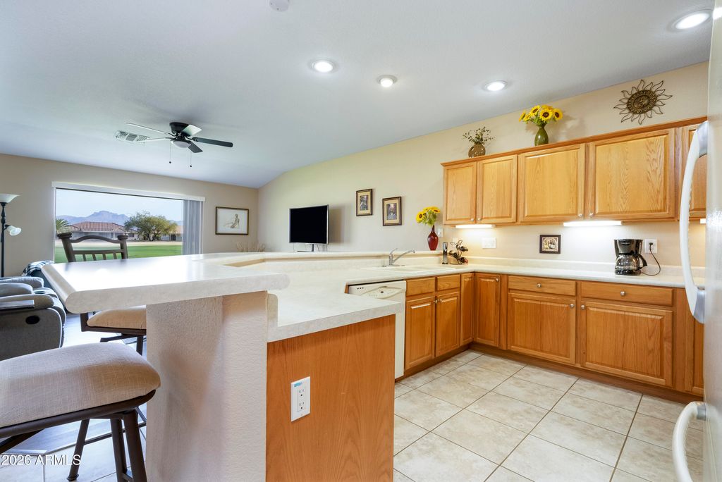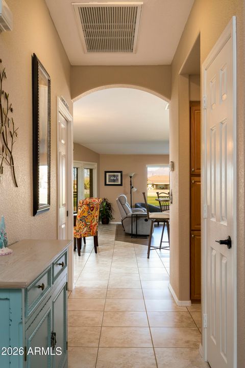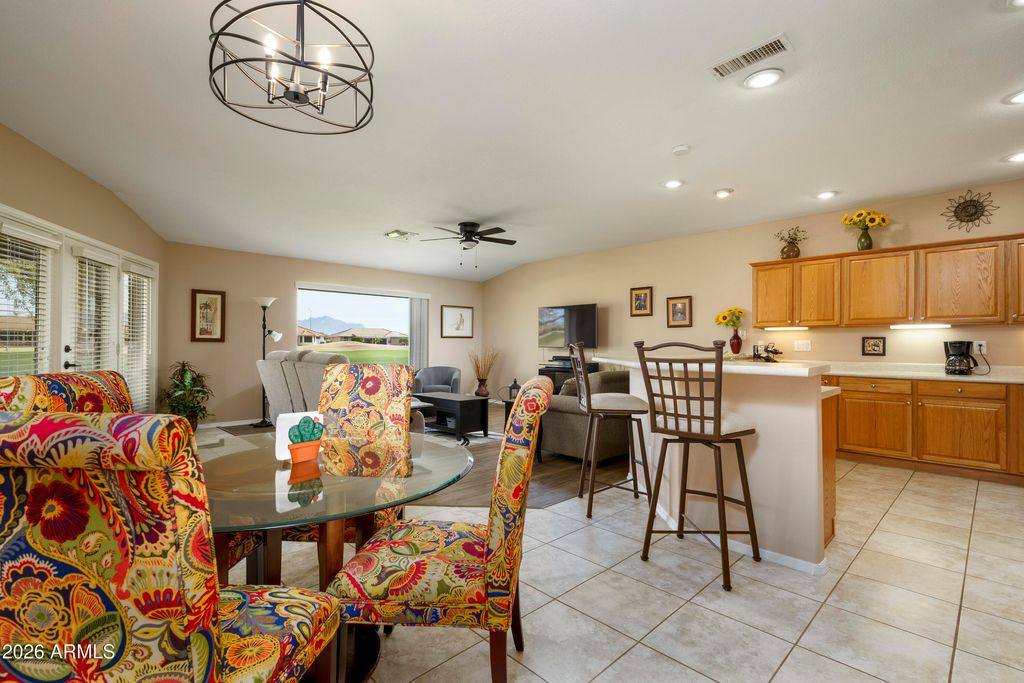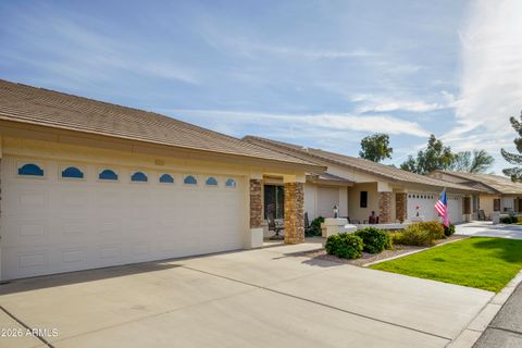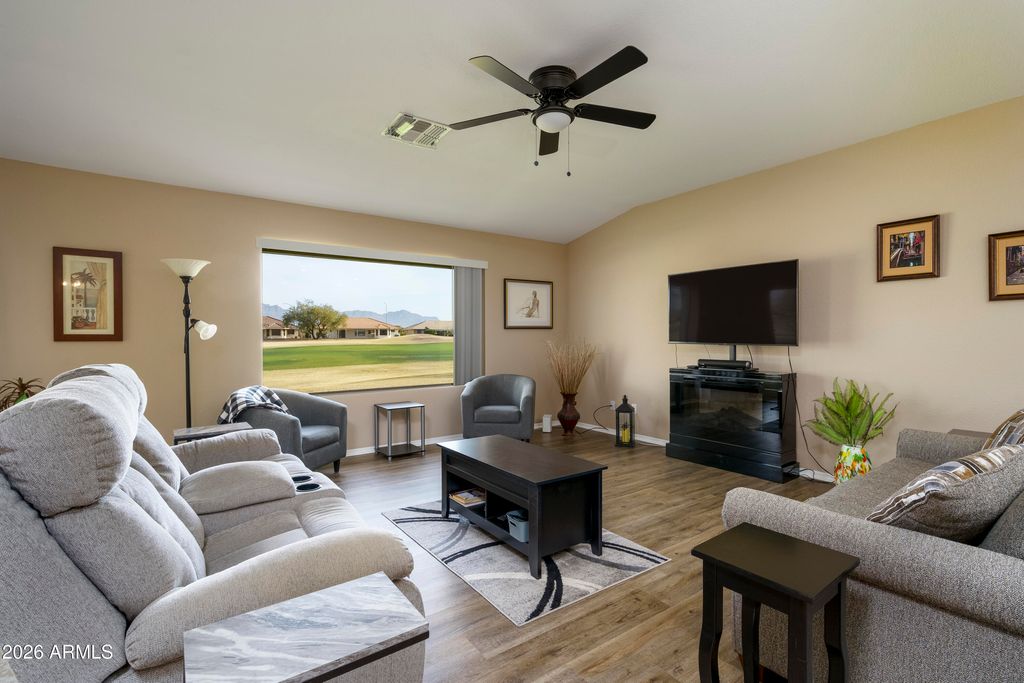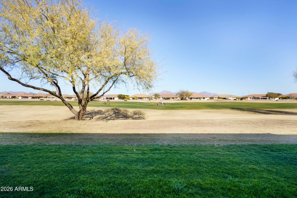 Golf course condo with beautiful Superstition Mountain views. 2 bedrooms, 2 bathrooms, 2 car garage in active 55+ adult community of Sunland Springs Village. Open ''great room'' layout for living room, dining, kitchen. New paint throughout the unit, luxury wood-style vinyl flooring in living area, master and guest bedrooms, tile flooring in traffic area, dining area,kitchen and both bathrooms. 2022 new A/C heat pump, water heater and soft water system, built-in cabinets in the garage! This property is ready for you to move in and enjoy! Community amenities include 27 hole golf course, tennis courts, pickle ball, heated swimming pools and much much more. Make the move, you won't regret your decision!