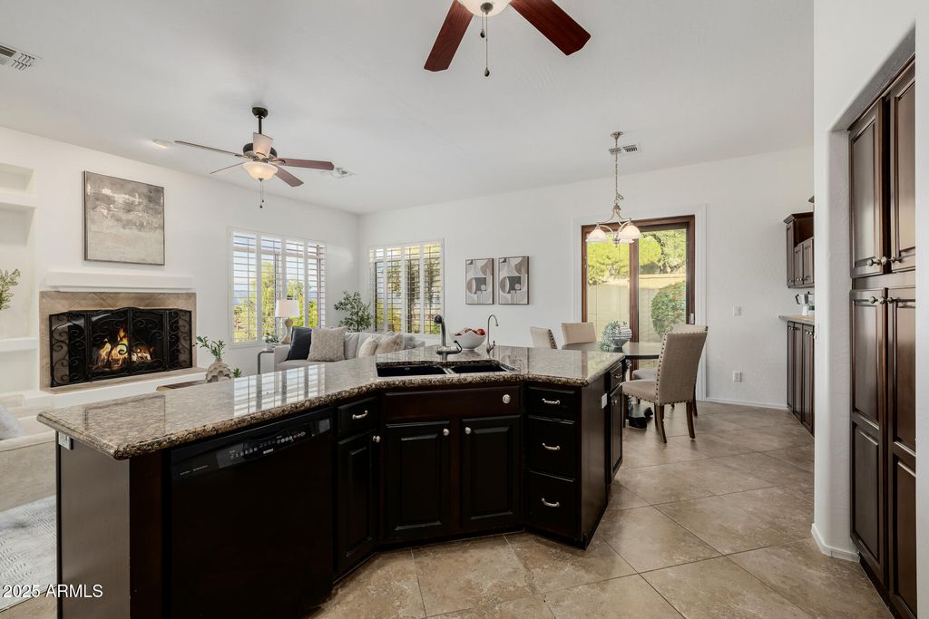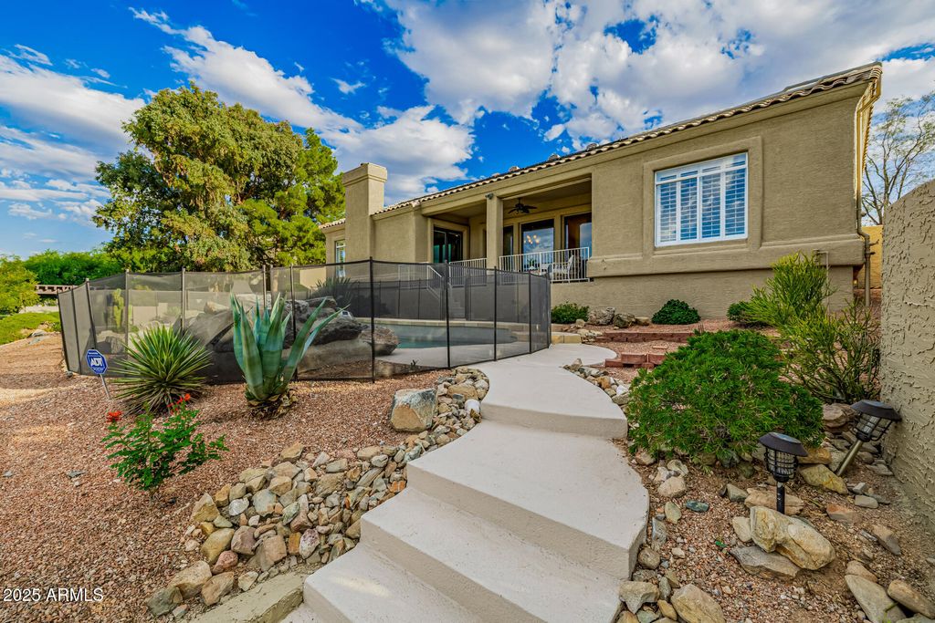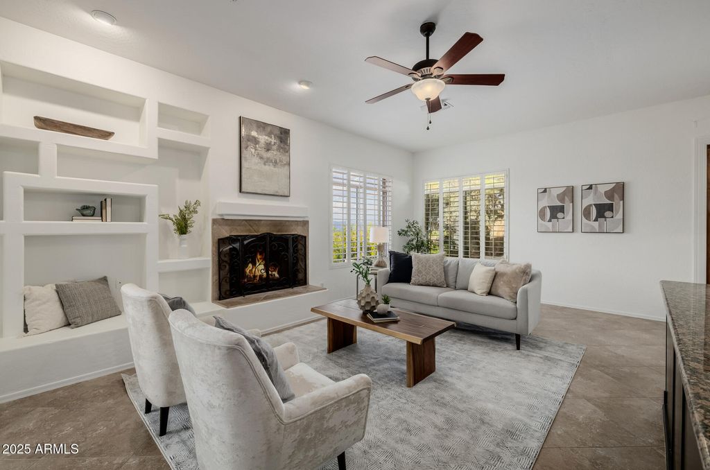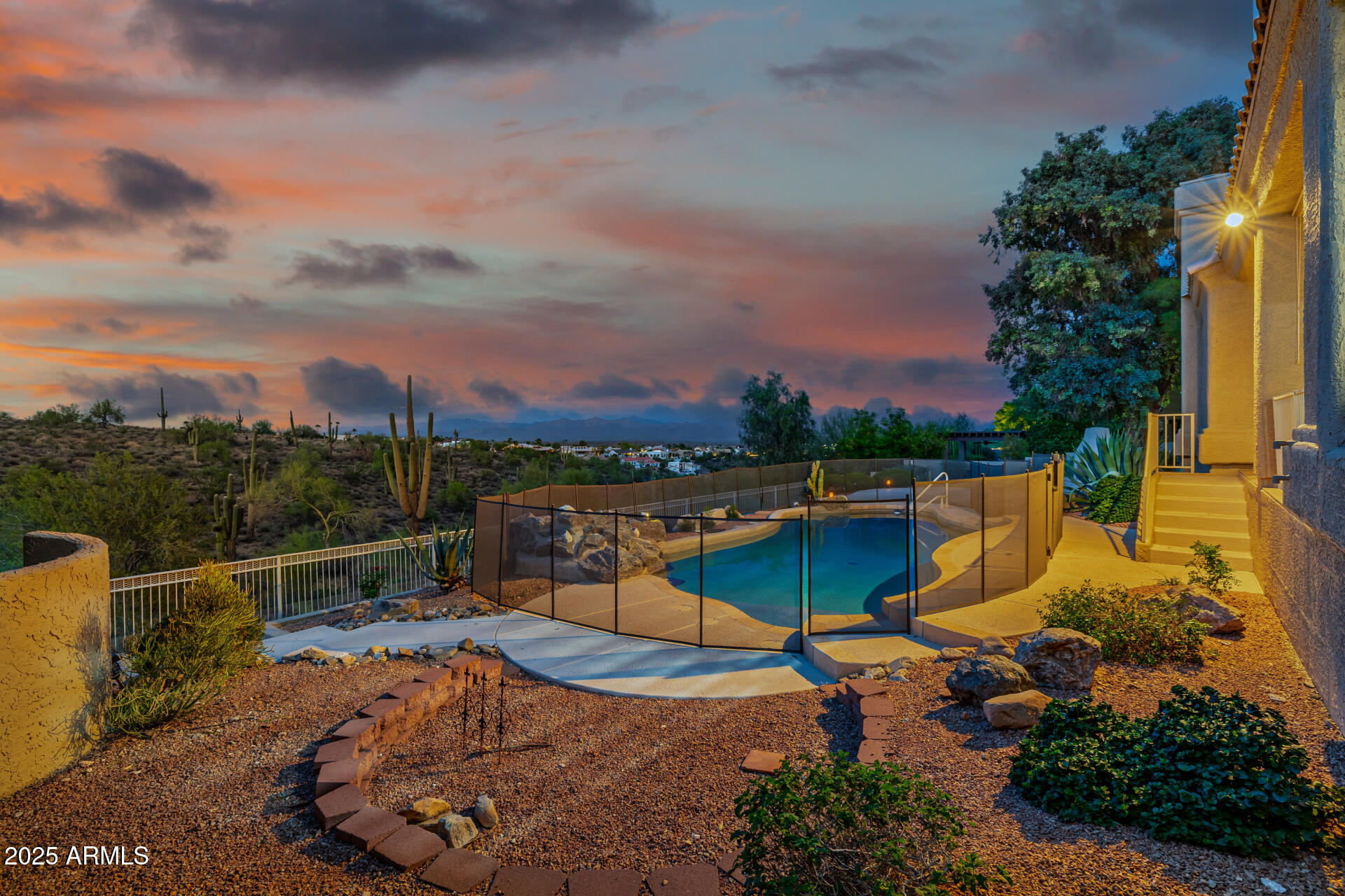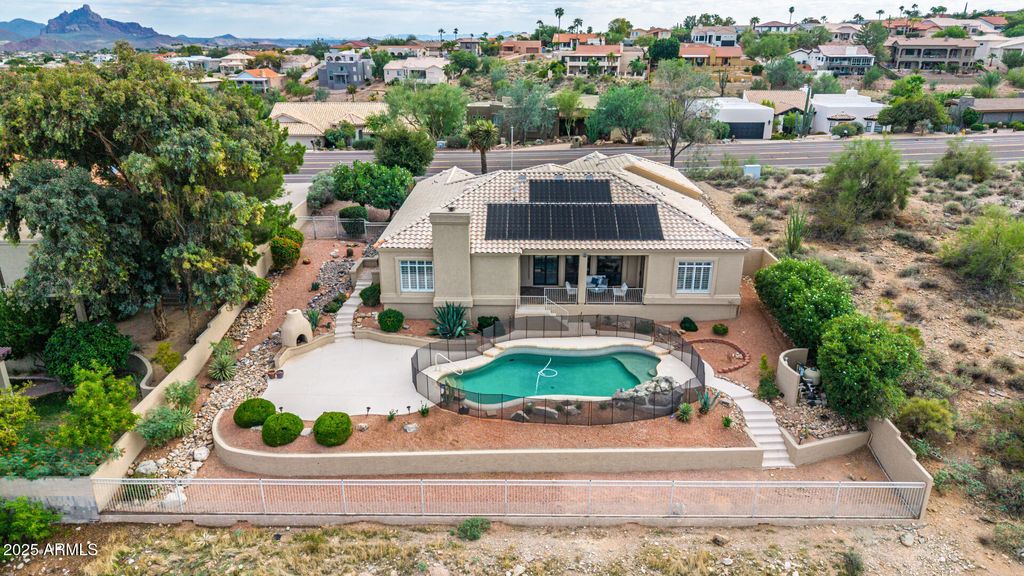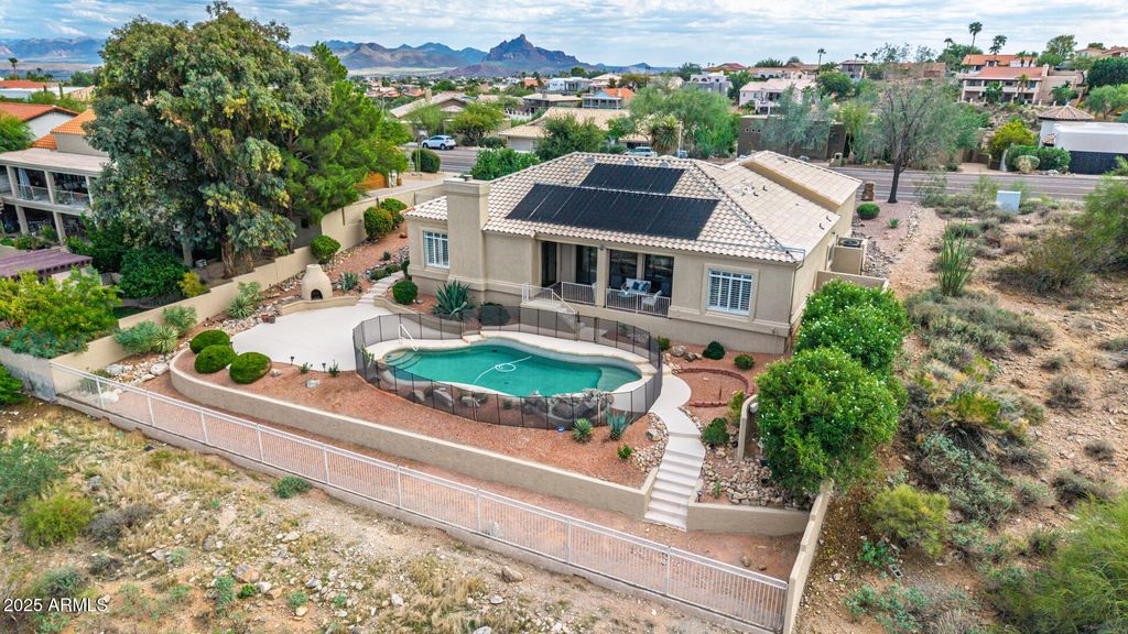 Experience stunning mountain and desert views from this beautifully maintained 4-bedroom, 2.5-bath home in Fountain Hills! Featuring timeless curb appeal with stone accents, a 3-car garage with built-in cabinets, and low-maintenance landscaping, this home blends style and convenience. Inside, enjoy vaulted ceilings, plantation shutters, neutral tones, and a new A/C system for year-round comfort. The open-concept kitchen offers granite countertops, custom cabinetry with crown molding, built-in appliances, and an island perfect for meal prep or entertaining. The spacious family room with fireplace and primary suite with patio access, walk-in closet, and spa-style bath make this home truly exceptional. Don't miss the breathtaking views and peaceful Fountain Hills living! Lastly, the wonderful backyard includes a covered patio, seating area w/an outdoor fireplace, a sparkling blue pool, and fantastic mountain & desert views! What are you waiting for?